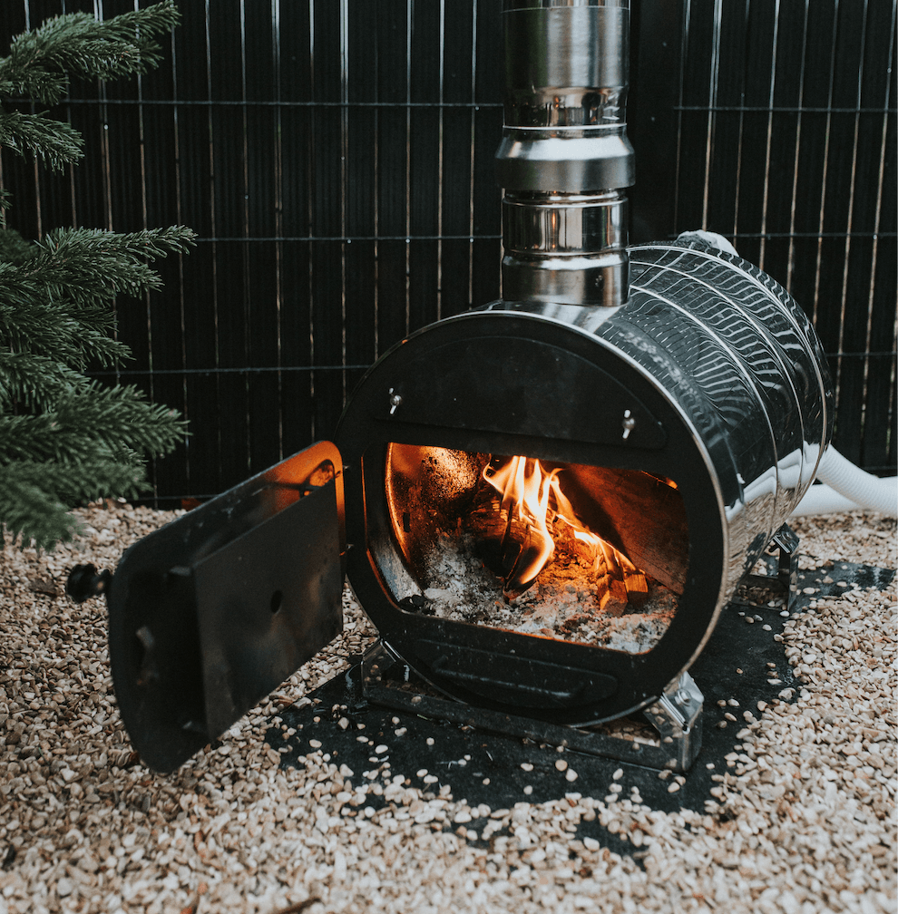 Le poêle à bois "Firebox" est en acier inoxydable spécialement conçu pour être en extérieur.